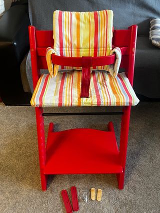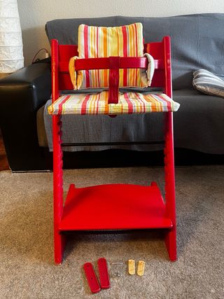 Trona Stokke en muy buen estado, ideal para los más pequeños. Su diseño clásico y funcional la hace perfecta para cualquier hogar. - Color rojo vibrante. - Incluye cojín a rayas multicolor. - Barra de seguridad rojo. - Incluye protectores de suelo