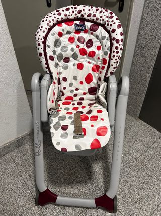 Trona Chicco Polly Progress 5 con un divertido estampado de lunares en tonos rojos, grises y burdeos. Es cómoda y fácil de limpiar. - Diseño con lunares. - Estructura robusta. - Marca: Chicco. Le falta un cinturon yo lo use sin y con la mesita se sujeta bien