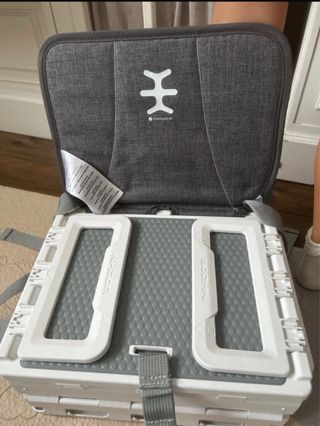 Trona portátil de la marca Nikidom, ultra compacta de color gris y blanco, ideal para llevar a cualquier lugar. Su diseño es plegable y cuenta con cinturones de seguridad. Está nueva - Respaldo acolchado. - Arnés de seguridad de 5 puntos. - Estructura de plástico resistente.