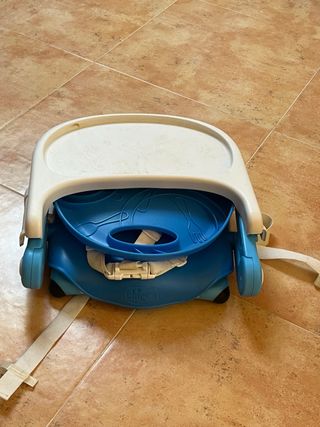 Trona portátil de la marca Chicco en color azul. Ideal para llevar a cualquier lugar. - Asiento cómodo. - Bandeja extraíble. - Arnés de seguridad.
