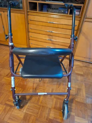 Andador plegable con asiento incorporado, ideal para facilitar la movilidad. - Estructura de metal resistente. - Asiento acolchado. - Empuñaduras ergonómicas. - Ruedas para desplazamiento.