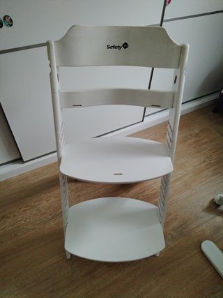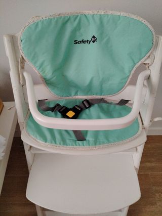 Trona de madera de la marca Safety 1st. Ideal para que los más pequeños coman cómodamente. - Fabricada en madera. - Bandeja extraíble. - Arnés de seguridad. Bastante usada pero es duradera. Las bandejas de asiento y pies son extraibles y acomodables a las alturas del bebe.
