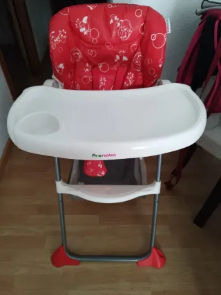 Trona para bebés de la marca Prenatal. - Color rojo con estampado. - Bandeja blanca. - Estructura plegable.