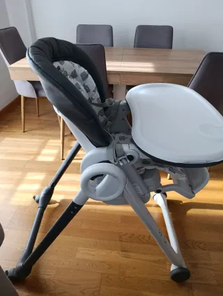 Trona de bebé en color gris y blanco, ideal para las comidas. - Asiento acolchado. - Bandeja extraíble. - Arnés de seguridad. - Estructura plegable para fácil almacenamiento. Se reclina hacia atrás Se posiciona en alturas El acolchado esta un poco rozado del uso
