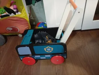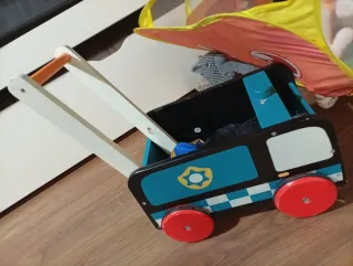 Andador de madera con diseño de policía. - Ruedas rojas. - Detalles en azul y amarillo. - Empuñadura naranja.