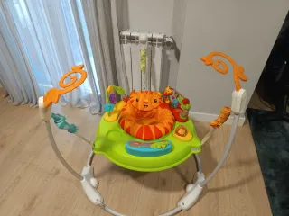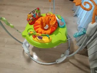 Saltador para bebés de la marca Fisher-Price con diseño de tigre. - Asiento acolchado con temática de tigre. - Estructura de plástico verde. - Barras de soporte con adornos naranjas. - Juguetes colgantes. - Base estable.
