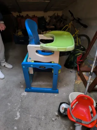 Esta trona se puede transformar en un escritorio, ofreciendo versatilidad para el crecimiento de tu hijo. - Asiento azul. - Bandeja verde. - Estructura azul y verde.