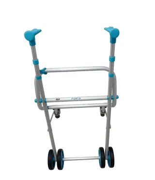 Andador ligero y plegable para adultos, diseñado para facilitar la movilidad. - Estructura de aluminio plateado. - Empuñaduras ergonómicas en color azul. - Ruedas delanteras y traseras para un desplazamiento suave. - Plegable para un fácil almacenamiento y transporte.