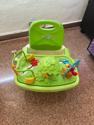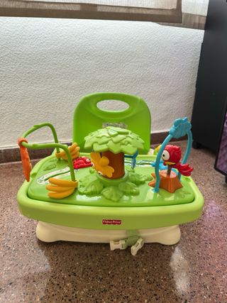 Trona portátil de la marca Fisher-Price, ideal para bebés. Su diseño es divertido y colorido, con elementos interactivos. - Color verde y blanco. - Base estable. - Asa para transporte. Esta en buen estado, lo único que las pegatinas estas peladas del tiempo.