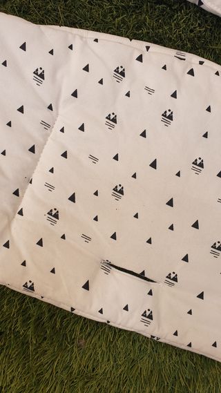 cojin y cubre respaldo de la trona tripp trapp en caja original estampado montaña blanco y negro