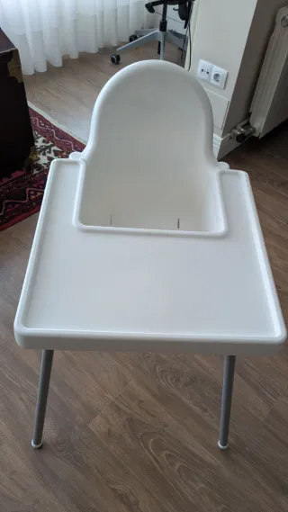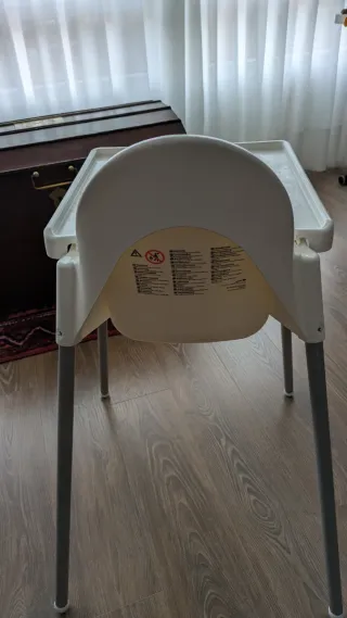 Trona de bebé de la marca Ikea en color blanco. Perfecta para las comidas de los más pequeños. NO TIENE BANDEJA - Estructura de plástico resistente. - Arnés de seguridad de tres puntos. - Patas estables.