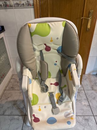 Trona Polly de Chicco. Se le han hecho nuevas fundas para reemplazar a la original que se había degradado. Una en perfecto estado sin usar. Incluye set completo de correas, bandeja y cubre bandeja y bolsa red original. Es plegable para ocupar poco espacio