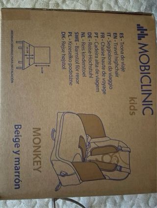 Trona de viaje para bebé, ideal para llevar a todas partes. Su diseño es cómodo y seguro. - Estampado de mono. - Arnés de seguridad. - Bolsillo lateral de malla. - Logo de Mobiclinic kids.