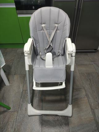 Trona en buen estado. Sería solo cambiar las correas de enganche o limpiarlas para que se quede como nuevo. Se regula en altura y los pies y respaldo son reclinables.