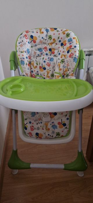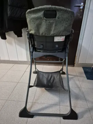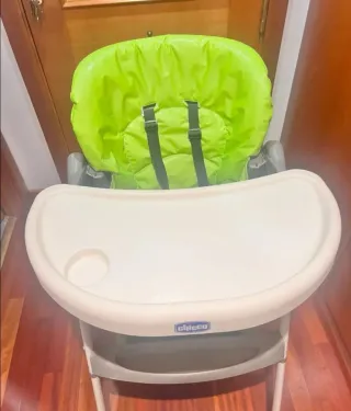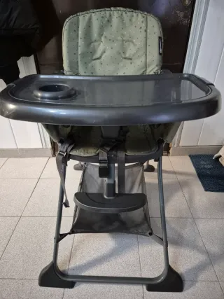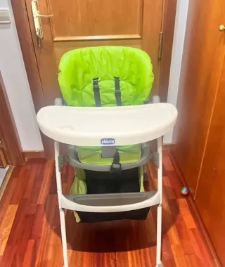 Trona para bebé de la marca Chicco, con un diseño plegable y práctico. - Asiento acolchado en color verde. - Bandeja extraíble. - Arnés de seguridad.