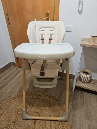 Trona Jane Mila en color glitter beige. Es cómoda y segura para los más pequeños. Tiene 5 meses. Sin apenas uso. Aún tengo la factura. - Asiento acolchado. - Arnés de seguridad de 5 puntos. - Bandeja extraíble. - Reposapiés. - Estructura de madera y plástico.