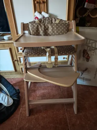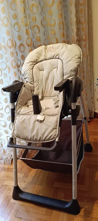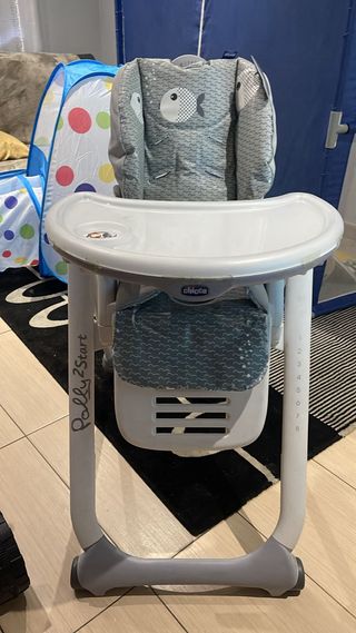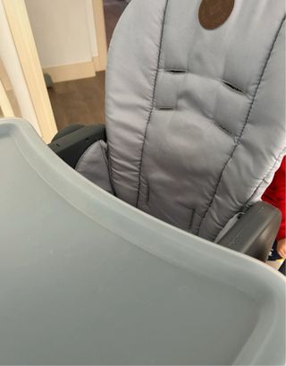 Trona Chicco con bandeja extraíble para usar desde bebe hasta que se canse de la misma. Lleva incluida cesta para guardar juguetes y accesorios. Del uso tiene una pequeña raja en la zona del enganche de la funda en el asiento que ya se cambió una vez y al ver que es normal que se rompa decidí poner un cojín porque además así estaba más cómodo cuando se sentaba.
