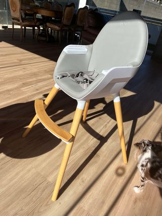 Trona evolutiva de la marca Kinderkraft. Mi hijo no la usa, está prácticamente nueva!!!! ideal para acompañar el crecimiento del bebé. puedes usarla sin bandeja, con bandeja, bajar las patas para una mesa más baja...etc PRECIO EN AMAZON 100€ - Diseño moderno y funcional. - Asiento cómodo y seguro. - Patas de madera. - Arnés de seguridad