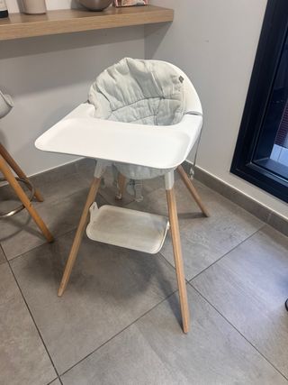 Trona de la marca Maxi-Cosi en color gris con patas de madera. - Bandeja extraíble. - Asiento acolchado. - Reposapiés ajustable.