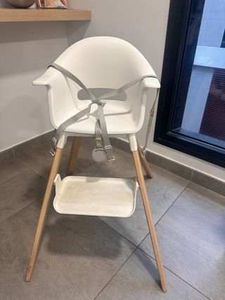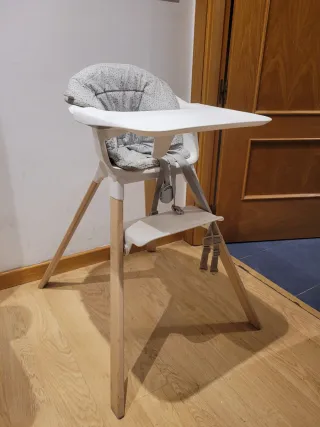 Trona Stokke Clikk en color blanco y madera en perfecto estado - Bandeja extraíble. - Cojín acolchado. - Reposapiés.