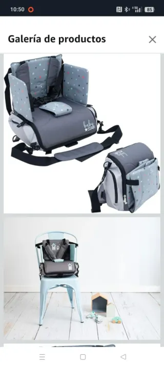 Trona de viaje, se sujeta al respaldo y al asiento mediante correas ajustables y luego al bebé con otras correas para que pueda estar sentado con seguridad. Se pliega y recoge en un maletín con asa, tiene cojín desmontable por si hay que lavarlo.