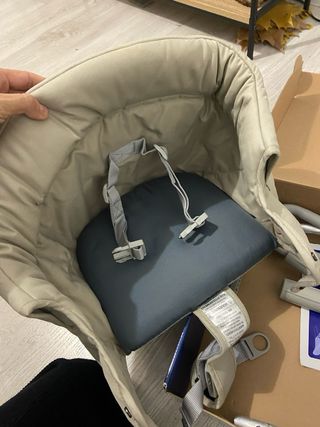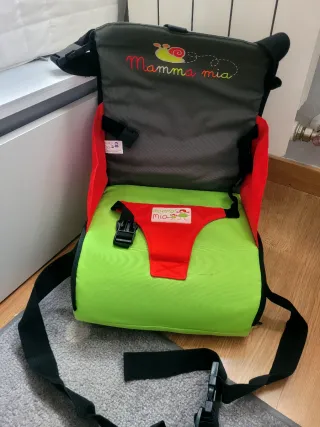 Bonita trona plegable de viaje. De adapta a la silla por medio de dos arneses.