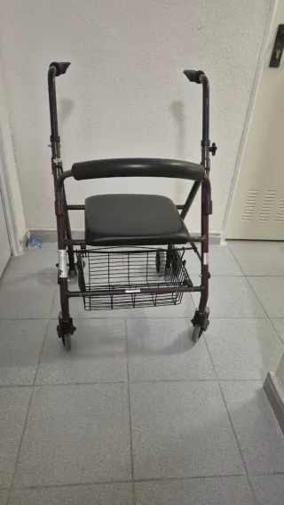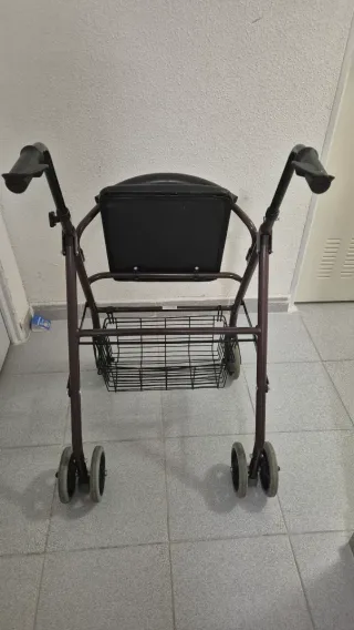 Andador con asiento y cesta. - Estructura metálica. - Asiento acolchado. - Cesta de almacenamiento. - Ruedas para facilitar el desplazamiento. - Perfecto estado, prácticamente no se usó.