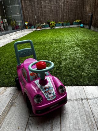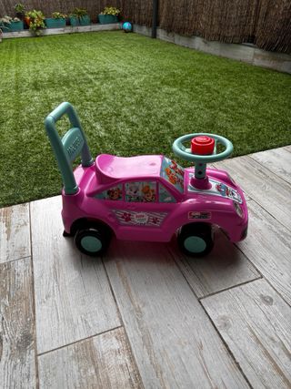 Coche correpasillos rosa con diseño de Paw Patrol. - Asa para empujar. - Volante con claxon. - Ruedas resistentes.