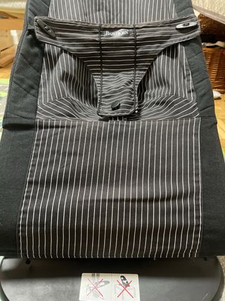 Hamaca y trona portátil de la marca BabyBjörn. Ideal para bebés y niños pequeños. - Diseño con rayas blancas y negras. - Incluye arnés de seguridad. - Base negra. - Tejido suave y acolchado.