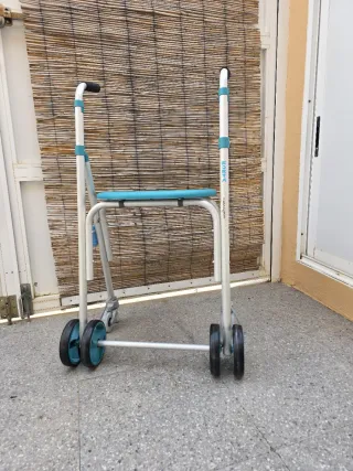 Andador ligero y plegable, diseñado para facilitar la movilidad. - Estructura de aluminio resistente. - Asiento y bolsa de transporte. - Ruedas para un desplazamiento suave.