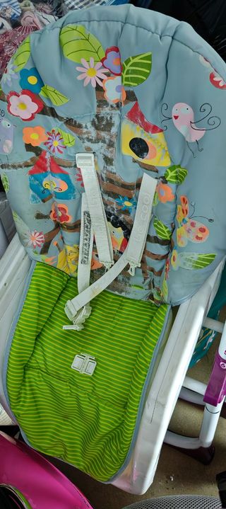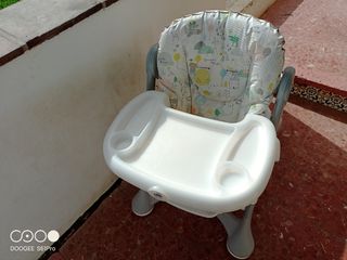 Trona de bebé de la marca Chicco, ideal para las comidas. - Asiento acolchado con estampado infantil. - Bandeja extraíble. - Estructura plegable para fácil almacenamiento.