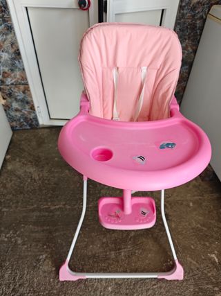 Trona evolutiva color rosa. Muy cómoda. Tiene varias alturas y posturas de respaldo. Se pliega. Aunque en la foto no aparece la bandeja, la tiene. Está muy bien cuidada.