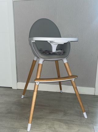 Trona evolutiva de madera, adaptable al crecimiento del bebé. - Material: Madera. - Diseño ergonómico. - Incluye arnés de seguridad.