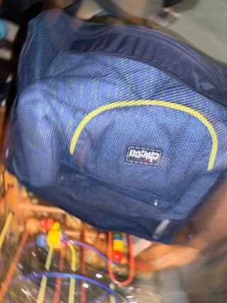 Es para llevar a comer fuera y poder senter al peque Trona de bebé en color azul, con un diseño moderno y práctico. - Material de malla transpirable. - Detalle de arco amarillo. - Etiqueta de marca visible.