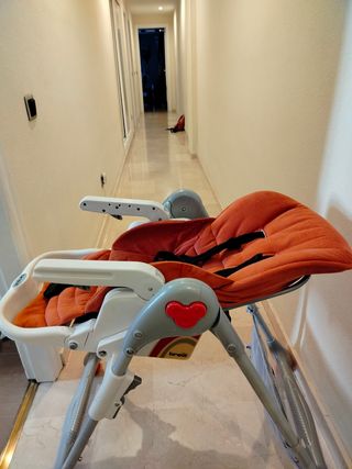 Trona Peg-Peregó de color rojo, ideal para los más pequeños. - Asiento acolchado. - Arnés de seguridad. - Reposapiés (es lo único que no está muy estable pero si se puede mantener bien) - Estructura resistente.