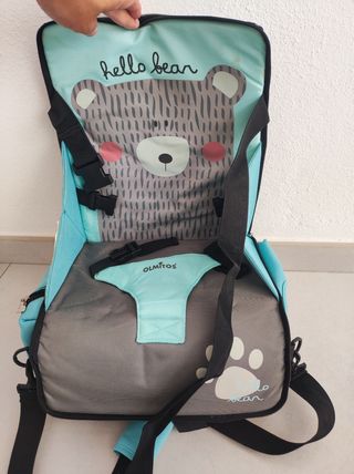 Preciosa silla portátil para niños de la marca Olmitos, con diseño de oso. Es ideal para llevar a cualquier parte. - Se pliega fácilmente para guardarla. - Incluye correas para sujetar al niño. - Está en buen estado. Pocos usos