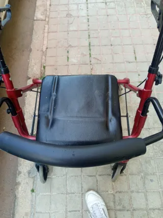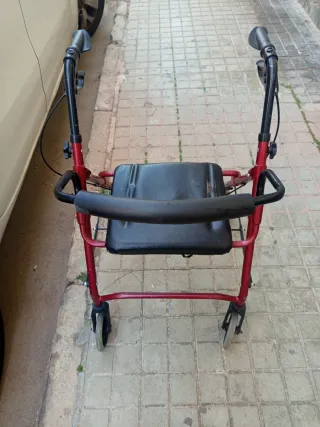 Andador plegable en color rojo, ideal para personas mayores. Cuenta con un asiento incorporado para descansar. - Estructura metálica. - Ruedas delanteras giratorias. - Empuñaduras ergonómicas.