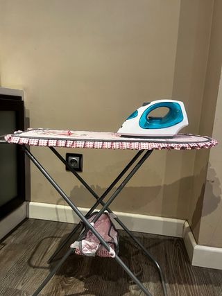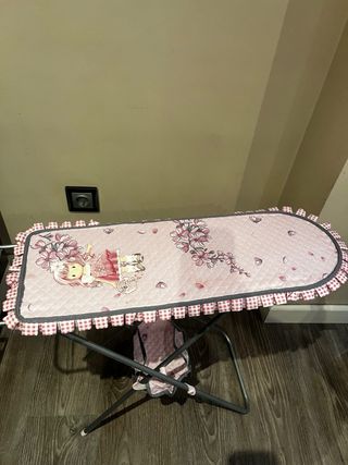Tabla de planchar de juguete con un bonito diseño. - Cubierta acolchada con estampado de flores y personaje. - Borde con volantes a cuadros. - Estructura metálica plegable. Se vende la tabla sola(20) o con la plancha(25)
