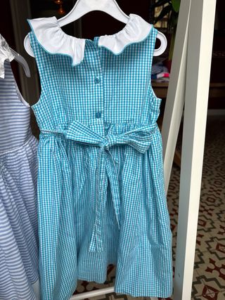 Lote de dos vestidos para niña talla 3T/4T (3/4 años). - Vestido azul de cuadros con smock y detalle de pecesitos. - Vestido azul a rayas con detalle de volantes.
