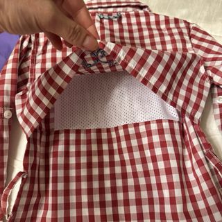 Vestido de manga larga con estampado de cuadros en tonos rojos y blancos. Presenta un divertido bordado de pez en la espalda. - Protección solar UPF20+. - Diseño de cuadros. - Bordado de pez. regalo chaqueta Columbia de lluvia con ello porque tiene pintada en el hombro.
