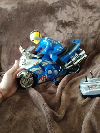 Divertida moto de radiocontrol con figura de piloto. - Moto de color azul y blanco. - Piloto con traje azul y casco amarillo. - Incluye mando a distancia