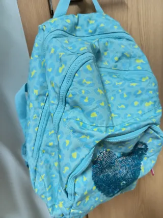Mochila en muy buen estado, con un diseño llamativo y colores vivos. - Estampado de manchas en azul claro y amarillo. - Corazón decorativo de lentejuelas reversibles en la parte frontal. - Dos compartimentos principales con cremallera. - Bolsillo frontal adicional con cremallera. - Asas ajustables y asa superior para colgar.