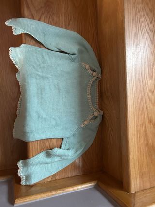 Jersey de punto en color verde menta, ideal para bebés. Tiene un diseño clásico y cómodo. Hecho a mano - Manga larga. - Cuello redondo. - Detalle de puntilla en puños y cuello. - Cierre con botones en el hombro.