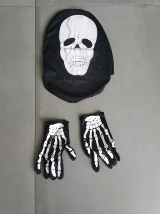 Conjunto de disfraz de esqueleto con máscara de calavera y guantes. - Máscara negra con diseño de calavera blanca. - Guantes negros con estampado de huesos blancos.