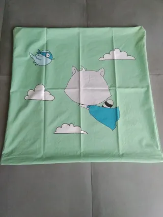 Conjunto de ropa de cama infantil con un divertido diseño. - Estampado de mapache superhéroe volando. - Incluye nubes y un pájaro. - Color verde menta.