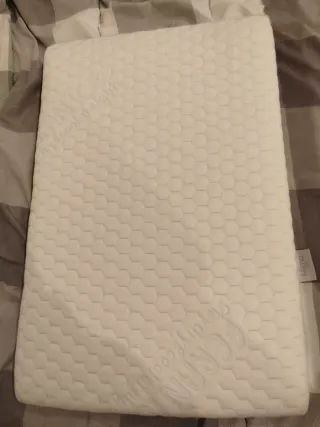 Colchón para minicuna de la marca Mimo Peti Mi. Diseñado para ofrecer comodidad y un descanso óptimo. - Tejido con diseño hexagonal. - Etiqueta de la marca 'Mimo' visible. Medidas 75×52 cm Regalo la funda protectora que compramos para el colchón.