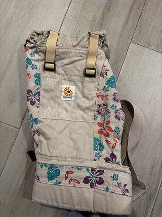 Mochila portabebés de la marca Ergobaby con un diseño floral. - Tejido principal en color beige. - Estampado de flores en tonos morados, rojos y turquesas. - Correas ajustables.