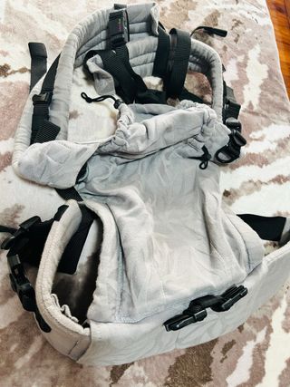Portabebés en color gris con un sutil estampado. - Tejido suave y acolchado. - Tirantes ajustables para mayor comodidad. - Hebillas de seguridad.