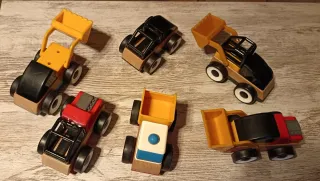Lote de 6 coches de juguete de madera y plástico de Ikea. Incluye excavadoras, camiones y un todoterreno. - Fabricados en madera y plástico. - Diseños variados intercambiables para estimular el juego. - Ideales para coleccionistas o para regalar.