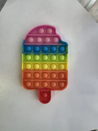 Divertido juguete Pop-It con forma de helado y diseño de arcoíris. - Colores vibrantes: rosa, azul, verde, amarillo y naranja. - Material de silicona flexible. - Diseño de helado mordido con palo.
